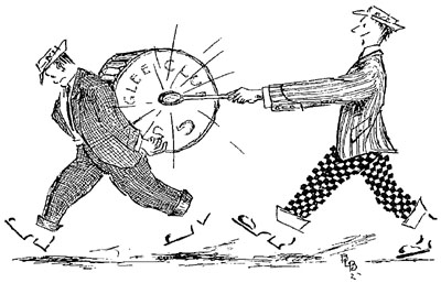 John Davis and Walter Aichel parading through Griffin,This unusual sight attracted a great deal of attention, as intended. It reminded one of the locals, an old man with a long beard, of the methods used by traveling patent medicine salesmen to attract a crowd. Standing near where Mr. Arno was watching the students, he asked another old man, “Is one of them medicine doctors going to give a show?”. “Naw,” his companion answered, “they’re advertisin’ for some new-fangled kind of glue; don’t you see how they’re sticking together? An’ I jest now heard a feller say as how it was a Glue Club from Atlanta.”